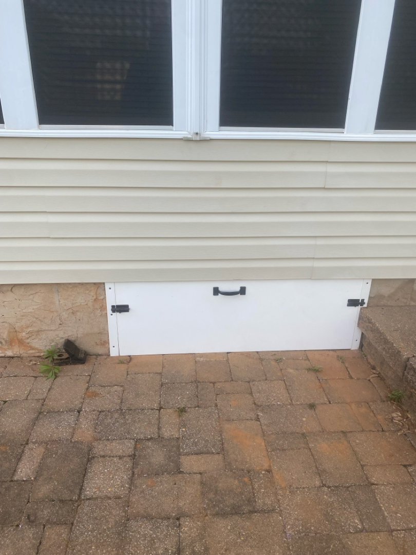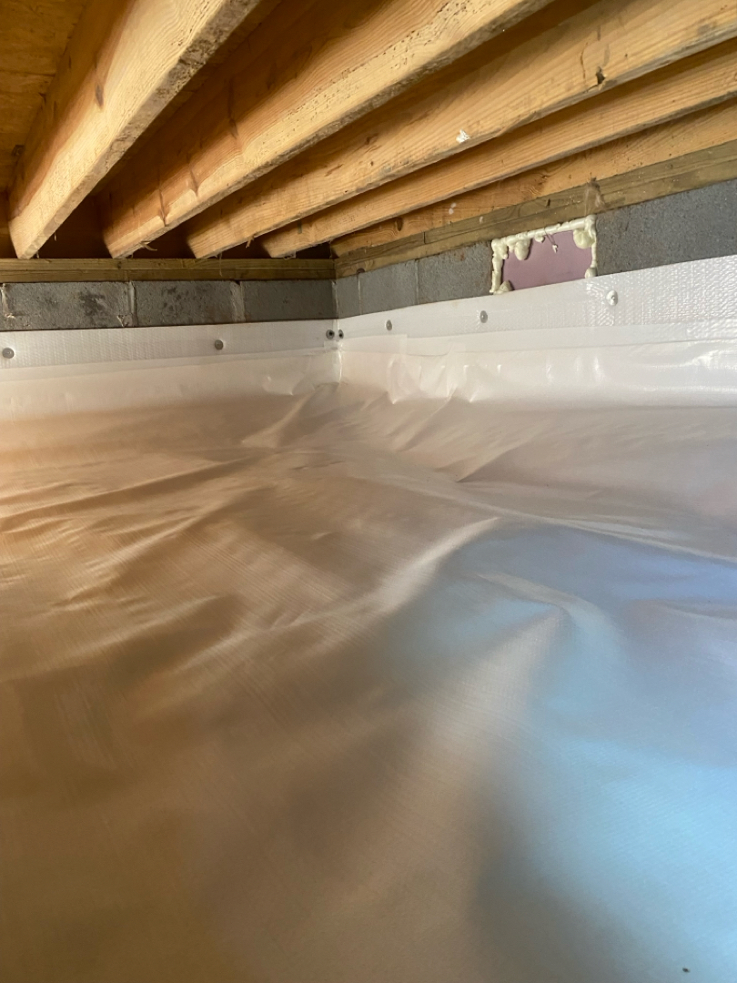 To properly address the fungus issue and prevent it from returning, we started by removing the existing crawlspace insulation, which was holding moisture and organic debris against the floor system and providing a food source for fungal growth. Next, we installed a drainage pipe system to direct any groundwater or intruding moisture toward a dedicated sump pump basin. In that basin, we placed a 1/3 HP sump pump and connected it to a discharge line that carries water safely away from the foundation, reducing the risk of future standing water under the home. To control humidity long-term, we installed a Sierra Watchdog NXT 85-pint dehumidifier, which works continuously to keep the crawlspace air dry and less favorable for mold and fungus. We also custom built a durable PVC crawlspace door to better seal the opening, helping keep out humid outside air and pests. Finally, we encapsulated the crawlspace with an R-5 insulated encapsulation system and a heavy-duty 15-mil floor liner, which covers the soil and walls to create a clean, insulated, and conditioned environment. Together, these steps not only addressed the existing fungal growth but also transformed the crawlspace into a dry, controlled space that protects the home’s structure and indoor air quality.