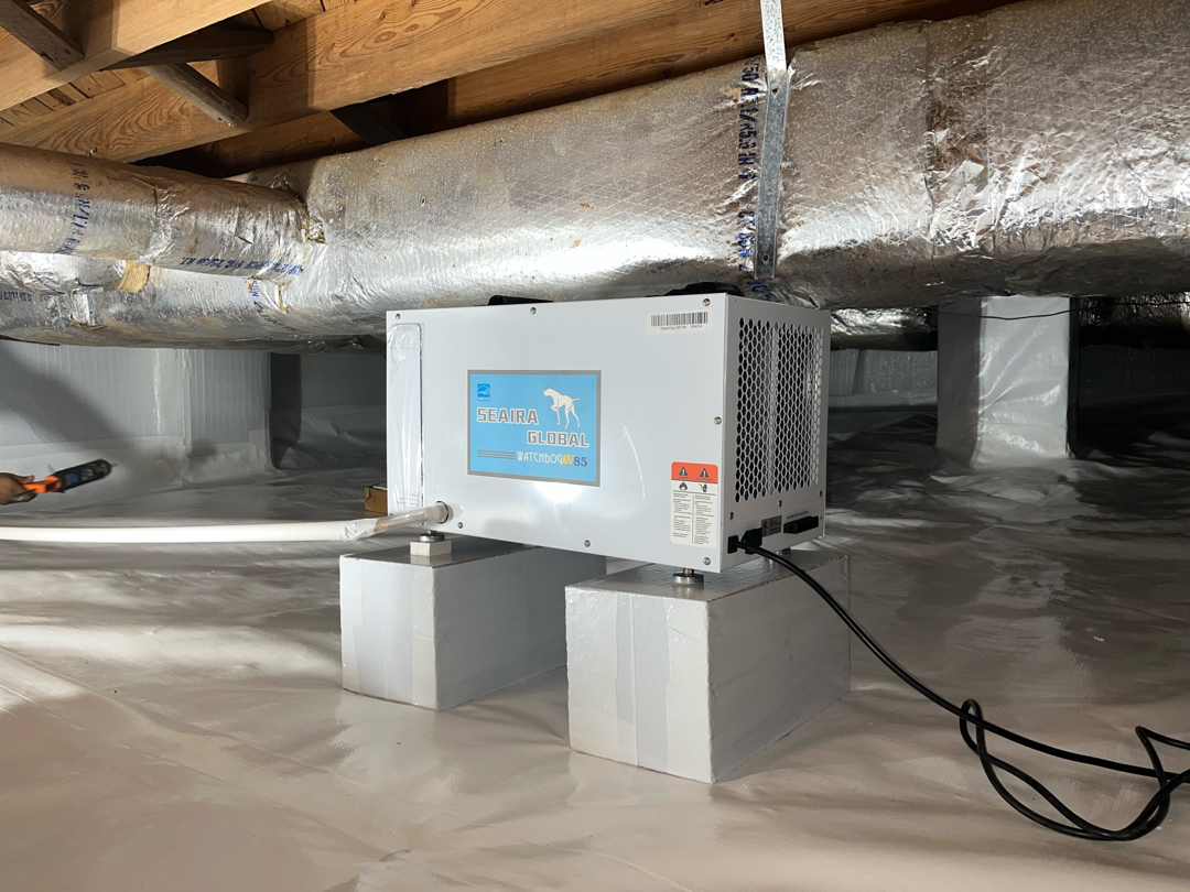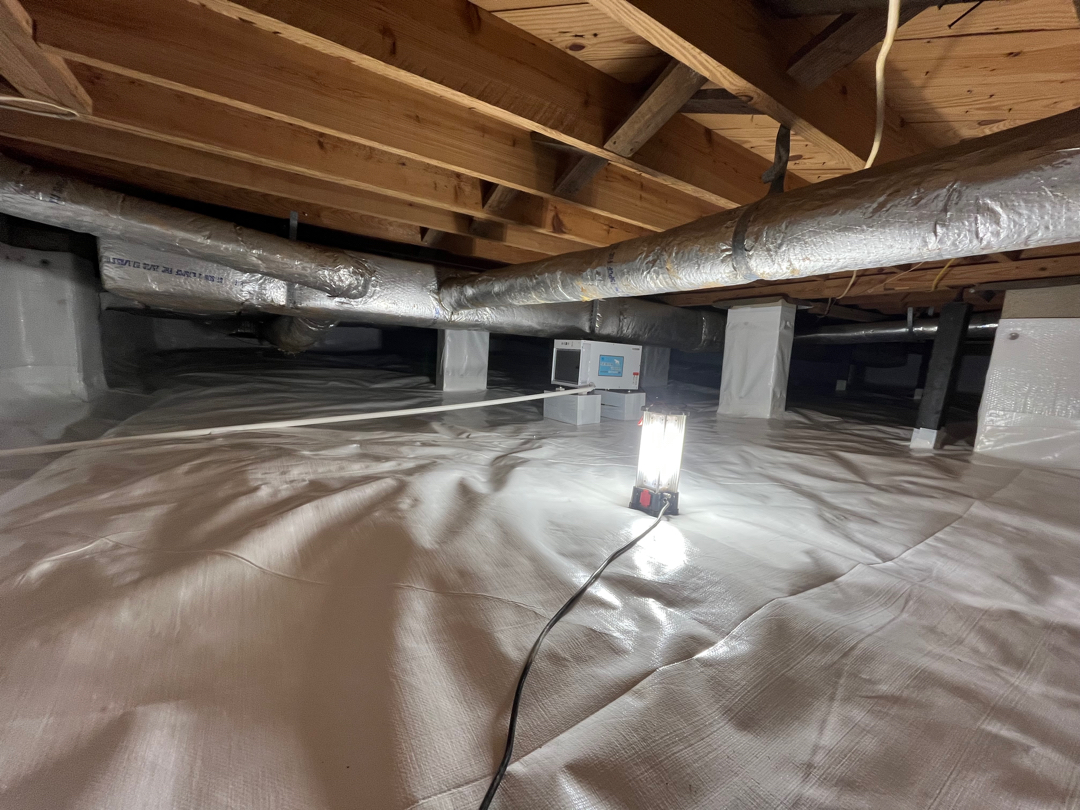 To address her request, we encapsulated the crawl space using an R-5 insulated encapsulation system with a durable 14-mil floor liner to separate the home from the damp ground and help improve energy efficiency. We then installed a Sierra Watchdog NXT 85-pint dehumidifier to control humidity levels and keep the air in the crawl space dry and stable. To finish the project, we custom-built a PVC crawlspace door, providing a tight, long-lasting seal at the entry point. Together, these steps created a cleaner, drier, and better-protected crawl space.