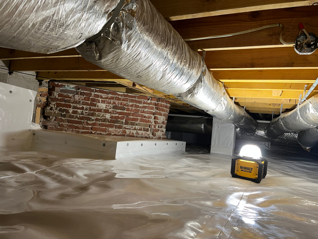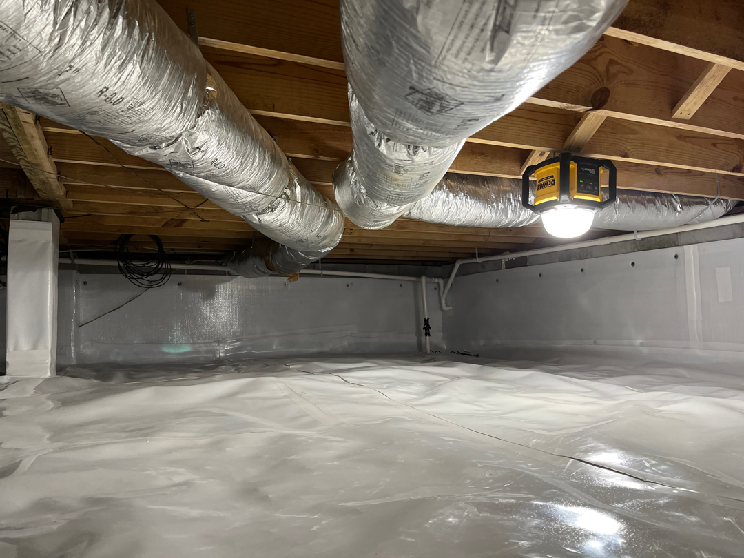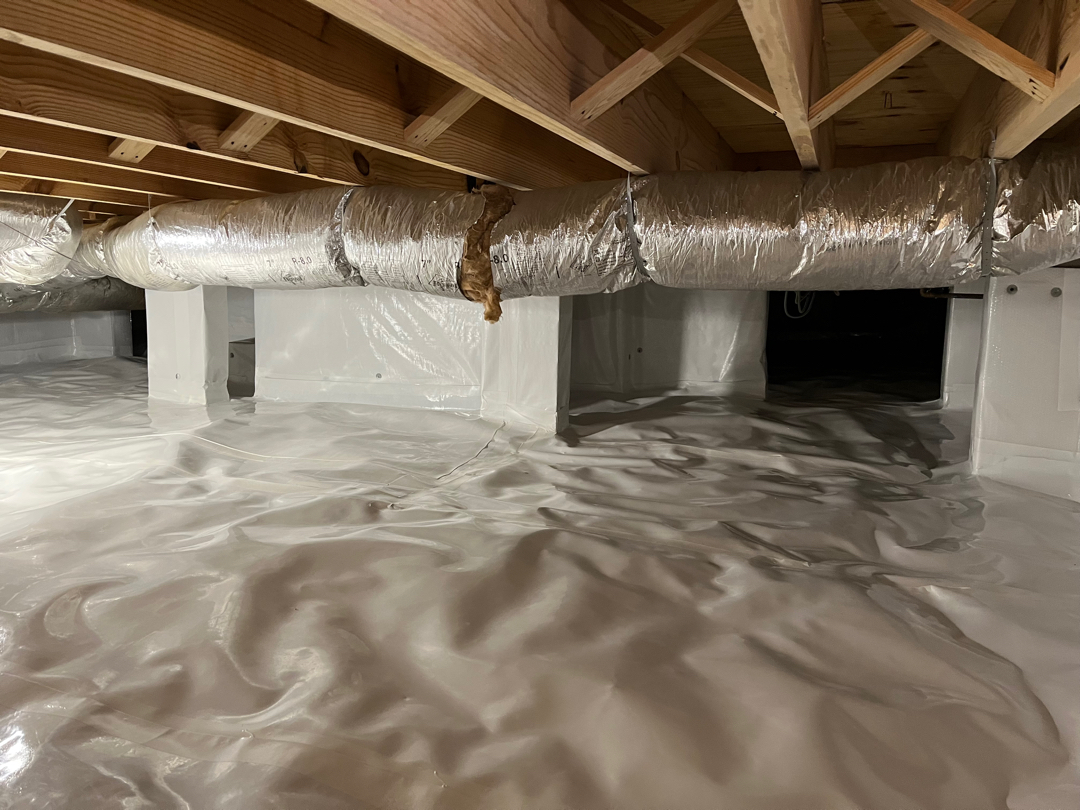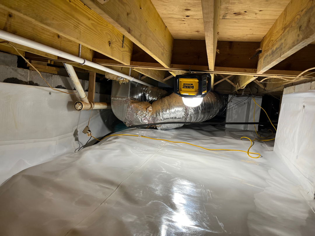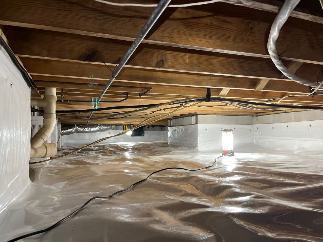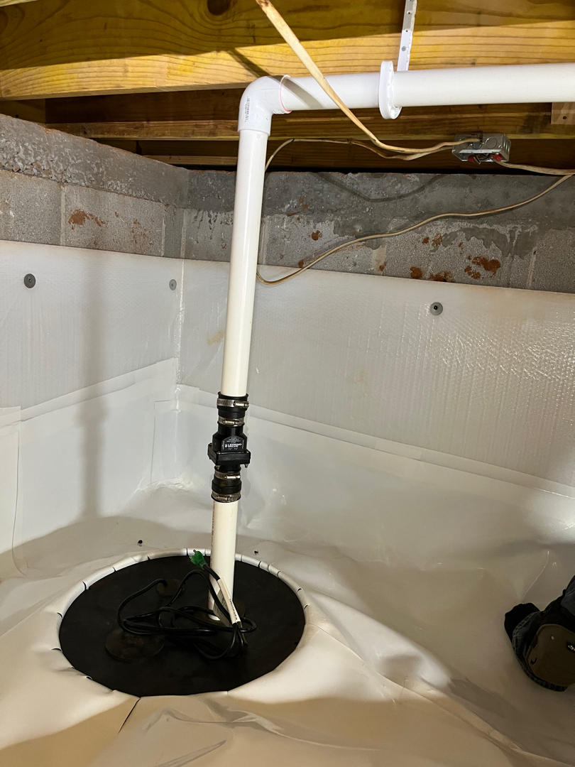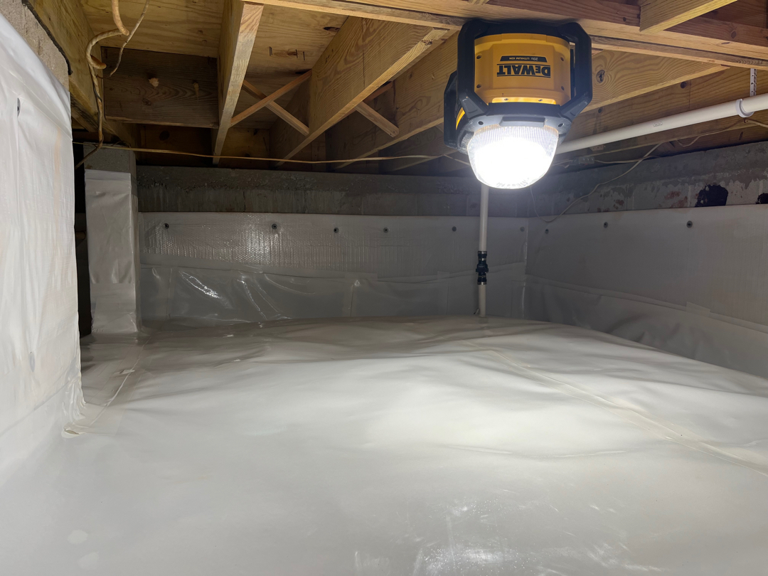 To solve the mold and moisture problem for good, we combined remediation with full water and humidity control. We started by soda blasting the affected surfaces to remove mold and clean the wood properly, then installed a full-perimeter drainage pipe system to capture groundwater and direct it into a new sump pump basin. From there, we added a dependable 1/3 HP sump pump and ran a dedicated discharge line to move water safely away from the foundation. Once bulk water was controlled, we sealed the crawlspace with our Crawlspace Doctor Exclusive Encapsulation System to block ground moisture and outside air from feeding future mold growth. To keep conditions stable year-round, we installed a Sierra Watchdog NXT 120 dehumidifier, and finished with a custom-built PVC crawlspace door to create a tight, durable entry seal—leaving the crawlspace clean, dry, and protected moving forward.