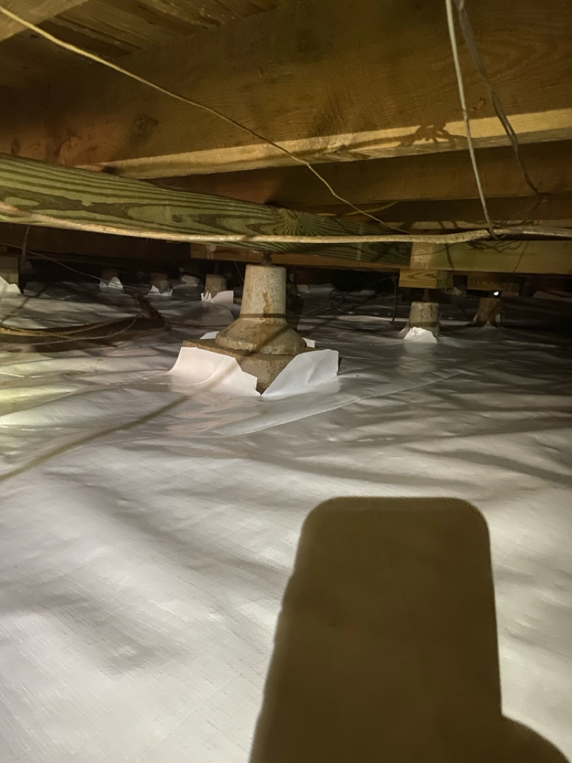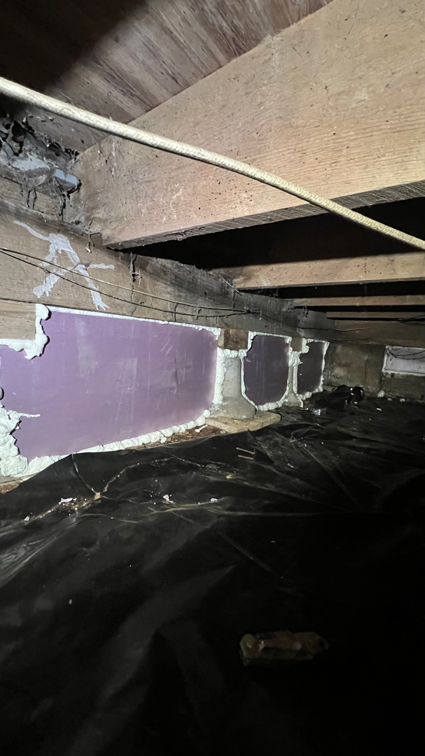 To solve the moisture and floor-shift issues in this 100-year-old home, we started with a Pro Cleaner hydrogen peroxide treatment to clean and treat the affected wood surfaces. Next, we installed a partial interior perimeter drainage pipe to intercept water where it was entering, and directed it to a new sump pump basin with a 1/3 HP sump pump and a dedicated discharge line to move that water safely away from the foundation. To reduce crawlspace humidity long-term, we blocked the foundation vents and installed a 15 mil vapor barrier to separate the home from ground moisture, then added a Sierra Watchdog NXT 85-pint dehumidifier to keep the air dry and stable. We also improved the seal and access point with a custom PVC crawlspace door. Finally, to correct the structural movement contributing to uneven floors, we installed a steel beam and added PowerPost floor supports to reinforce and stabilize the framing—helping stop future sagging and shifting while supporting a more level floor system.