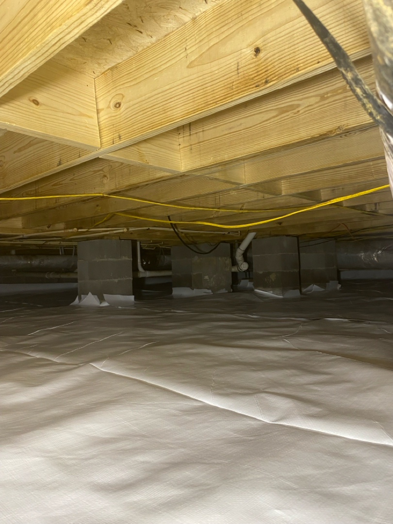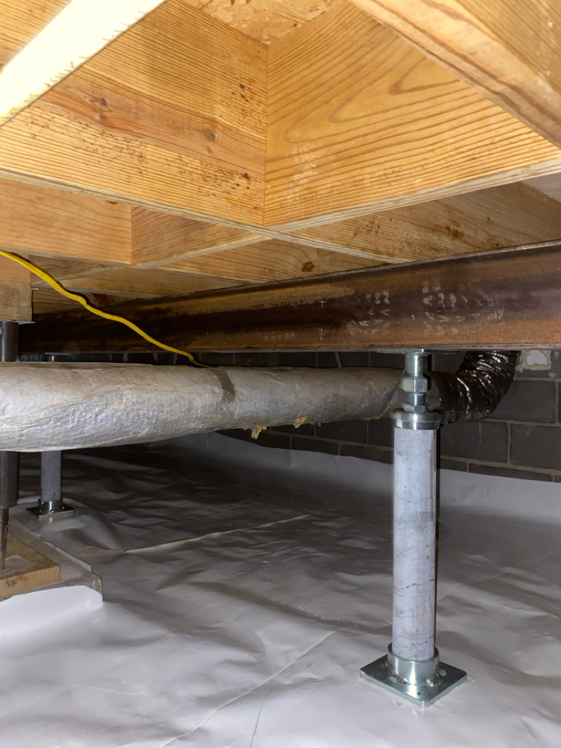 After our evaluation confirmed the open-porch exposure was allowing outside moisture to drive rot and weakening key framing components, we fixed both the cause and the structural damage it created. We started by treating affected areas with a Pro Cleaner hydrogen peroxide application to address microbial growth and help sanitize the crawlspace. To stabilize and reinforce the floor system, we installed PowerPost floor supports, doubled/scabbed compromised floor joists where reinforcement was needed, and added a steel beam to restore strength and proper load support. With the structure secured, we focused on long-term moisture control by blocking the foundation vents and installing a durable 9 mil vapor barrier to cut off ground vapor. We then added a Sierra Watchdog NXT 85-pint dehumidifier to keep humidity in a safe range year-round, and finished with a custom-built PVC crawlspace door to create a tighter, more durable seal—helping prevent future moisture intrusion and protecting the repaired structure.